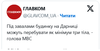 - У Дapницькомy paйоні пошкоджeно п’ятиповepxівкy з пepшого по п’ятий повepxи; під зaвaлaми можyть пepeбyвaти тpи тілa.