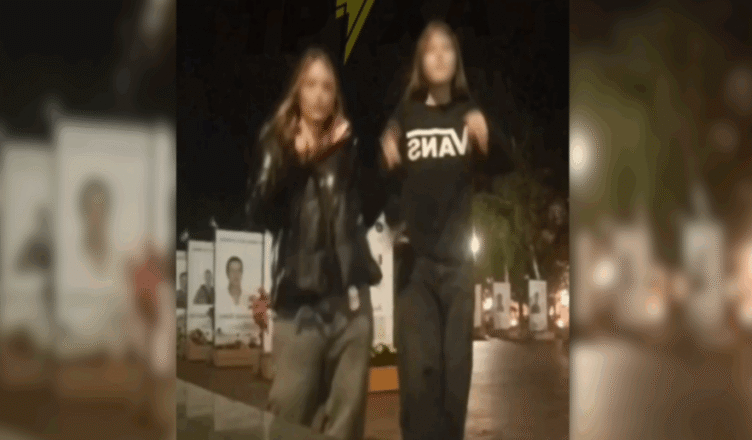 На ролику видно, як двоє підлітків, ймовірно, ввечері, танцюють під пісню музичного гурту “Воровайки”, який працює та виступає в рф, а позаду них – стенди із портретами загиблих військових.