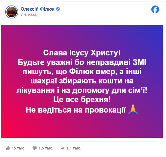 Слава Ісусу Христу! команда вже прийшла виносити Філюка, а його відкапали і буде жити…не ведіться на фейки