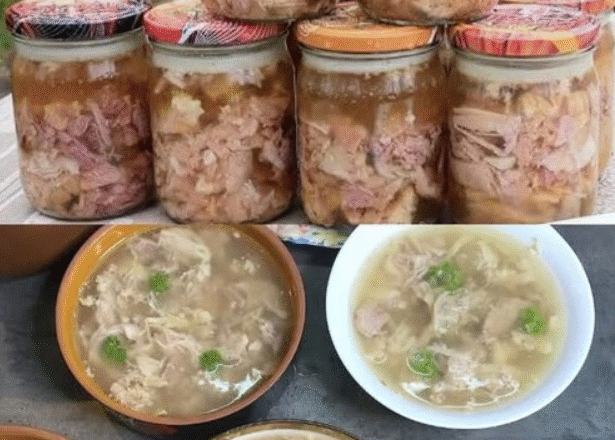 Я розлив готовий яловичий холодець у банки по 350 мл, додавши в кожну по 100 г м’яса і 200 мл бульйону. Стерилізація проходила під парою при тиску протягом години. Для банок об’ємом 0,5 літра я стерилізував би при 120 градусах протягом 75 хвилин. Після приготування швидко охолоджую до кімнатної температури та зберігаю у прохолодному місці до застигання. Рішення напрочуд просте.