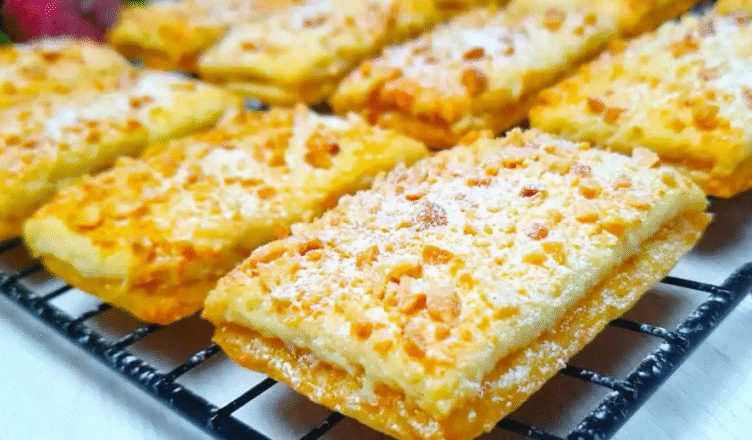 Тісто розкачую між двома аркушами пергаменту в прямокутний пласт 25 на 35 см. Розподіляю яблучну начинку. Накриваю другим шаром тіста і розрізаю на 32 прямокутники. Змащую яйцем і посипаю подрібненими горіхами.