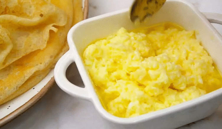 У каструлю з товстим дном кладу масло, ставлю на середній вогонь, розтоплюю. В окремій мисці змішую яйця з сіллю. Тепер вливаю яйця в розтоплене масло і постійно помішуючи, прогріваю яйця, не потрібно їх сильно засмажувати, як тільки маса почне густіти, знімаємо з вогню, вона має бути ніжною.