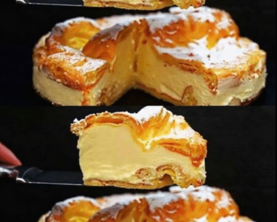 Перед подачею присипаю торт цукровою пудрою. Нарізаю порційними шматочками — вони виходять м’які, ніжні, крем буквально тане в роті. Цей торт дуже простий у приготуванні, а смак просто неймовірний. М’яке заварне тісто та ніжний крем роблять його схожим на великий еклер, тільки ще смачніший!