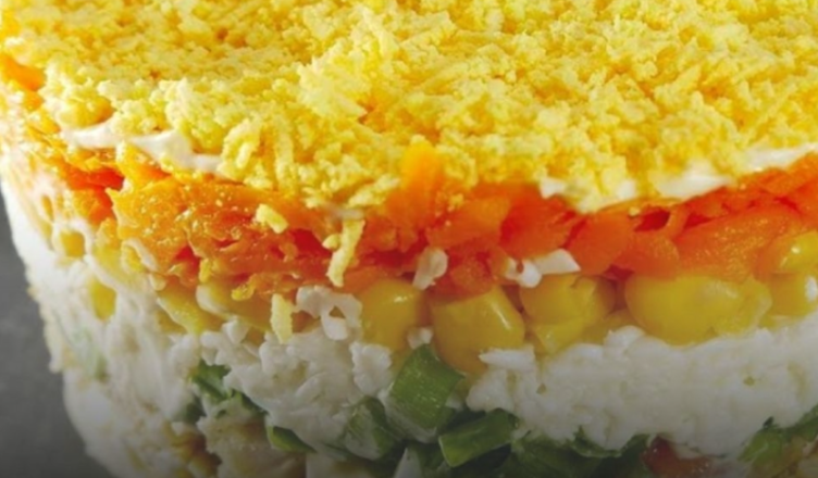 Шостий шар — це натерті білки яєць (жовтки відкладіть). Білки змащуємо майонезом і зверху викладаємо кукурудзу. Кукурудзу також трошки змащуємо майонезом. Наступний шаром буде натерта морква, і моркву посипаємо натертими жовтками.
