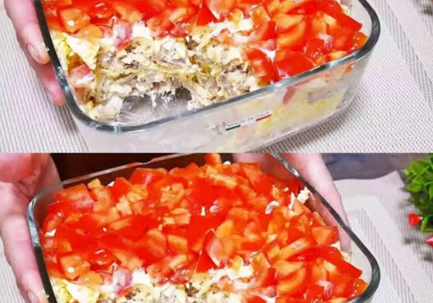 У мене останній шар салату порізані кубиками помідори.