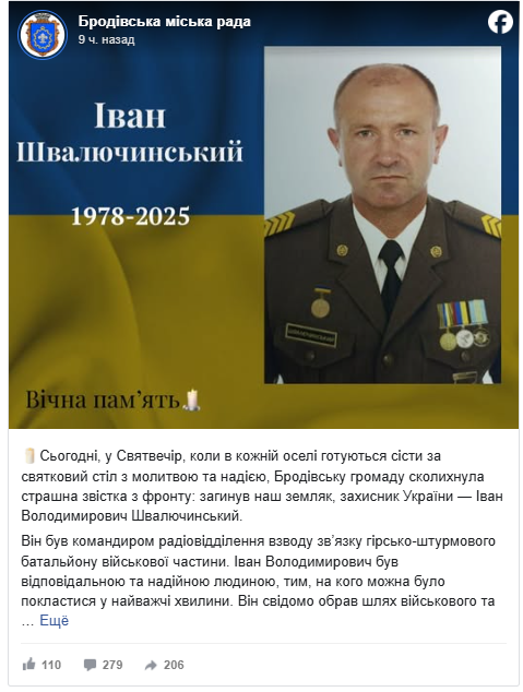 Сьогодні, у Святвечір, Бродівська громада отримала трагічну звістку з фронту: загинув наш земляк, захисник України Іван Володимирович Швалючинський. Про це повідомляє Бродівська міська рада.