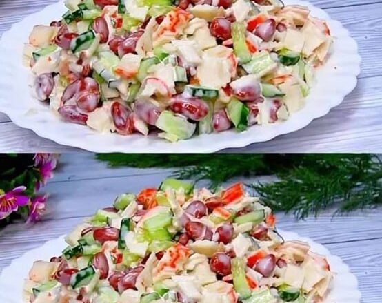 Огірок, крабові палички нарізаю кубиками. Всипаю квасолю, часник натираю на терці.