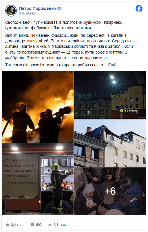 Як зазначив Порошенко, у ніч на атаку російські війська завдали ударів по пологовому будинку, лікарні, гуртожитку та багатоповерхових житлових будинках у Харкові, а також по цивільних об’єктах у столиці.