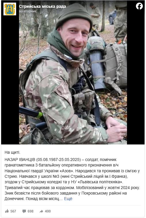 З травня минулого року Назар Іванців вважався зниклим безвісти. Родина понад вісім місяців сподівалася на диво, однак нещодавно його загибель була підтверджена за результатами ДНК-експертизи.