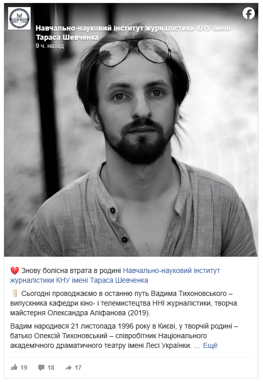 Сьогодні, 2 березня 2026 року, у столиці відбулася церемонія прощання з військовослужбовцем, фотографом та кінооператором Вадимом Тихоновським. Про загибель захисника повідомив Навчально-науковий інститут журналістики КНУ імені Тараса Шевченка, випускником якого він був. Вадим народився 21 листопада 1996 року в Києві та присвятив своє життя візуальному мистецтву. У 2019 році він закінчив творчу майстерню Олександра Аліфанова на кафедри кіно- і телемистецтва. Його талант проявився ще під час навчання, зокрема у стрічці «Створення», яку він представляв на конкурсі документальних фільмів «Кіноко».